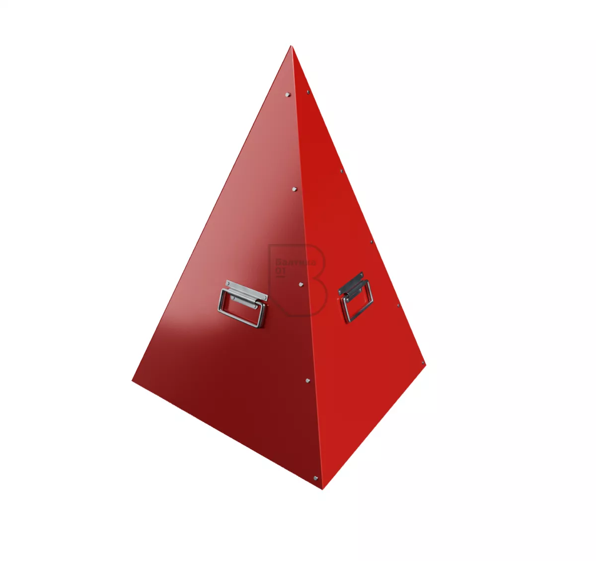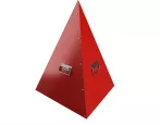 Пирамида для пожарного гидранта имеет треугольное основание, выполнена из металлических листов. Для удобства установки, переноски или снятия с колодца имеет по бокам ручки. Пирамида окрашена в сигнальный красный цвет, чем привлекает к себе внимание с большого расстояния, тем самым предостерегая от несчастных случаев при проведении работ.