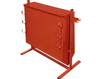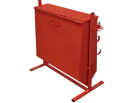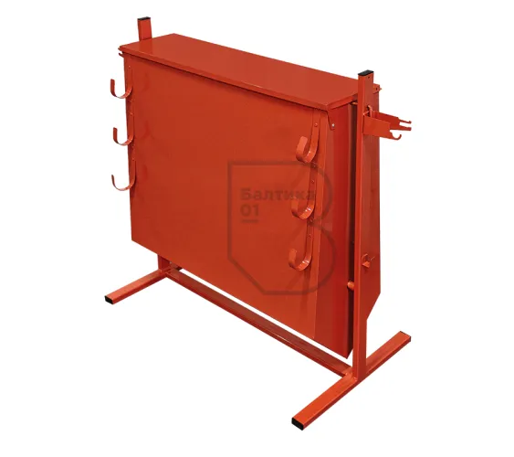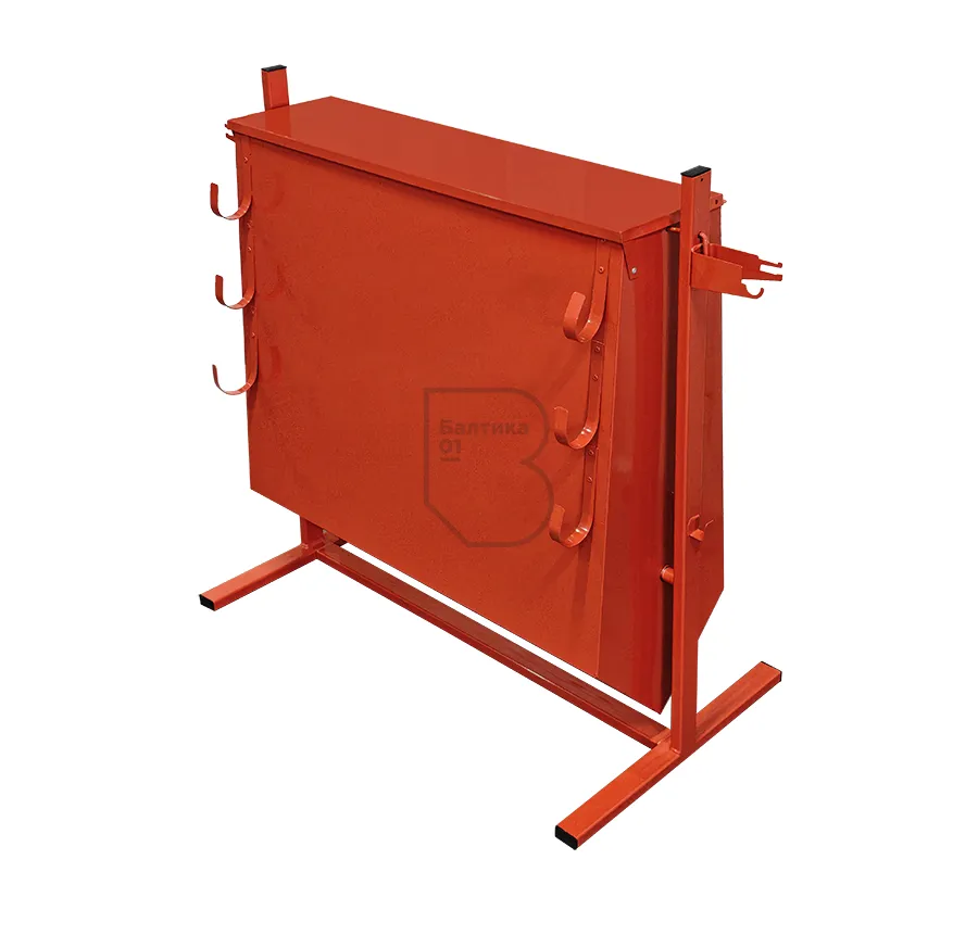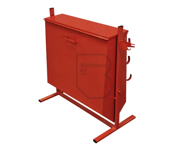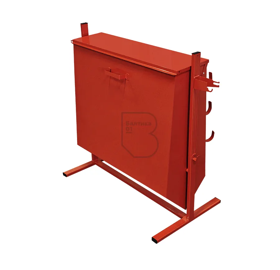 Стенд пожарный металлический «Бункер» предназначен для компактного размещения пожарного инвентаря и песка (в закрытом переворачивающемся бункере объёмом 0,2м3).